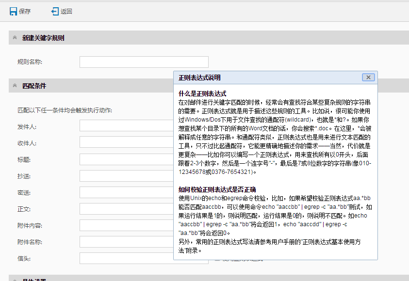 设定规则名称、匹配关键字内容。关键字过滤类型可选择设定包括信头、主题、信体、附件名的过滤关键字。然后选择所要执行的操作。