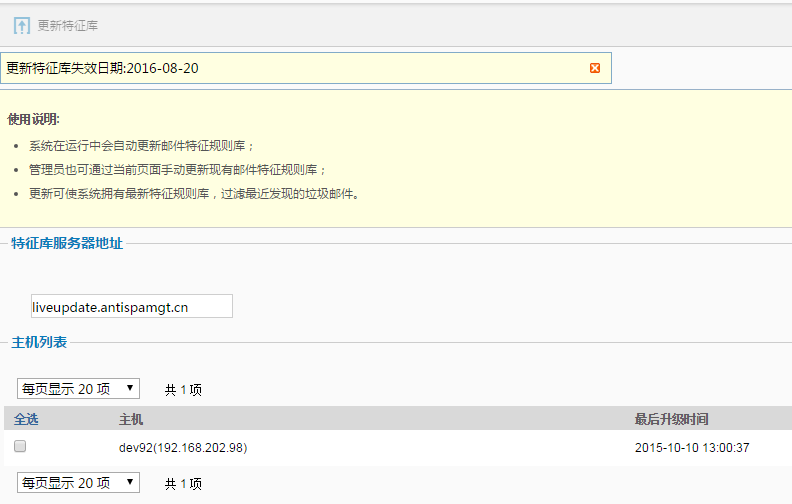 更新特征库是Anti-spam GT保证实时的反垃圾邮件功效,可以通过网络连接实时地从远程特征数据中心上更新过滤特征数据库,从而保证系统具备最新的过滤规则信息,过滤最新发现的垃圾邮件。