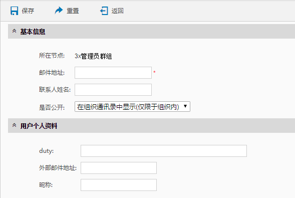 通过点击“新建”的下拉菜单找到“联系人”,可添加不属于当前组织系统的外部联系人到组织通讯录中,从而使得这些外部联系人同样显示在组织通讯录中,便于当前系统的所有用户查看及写信等。