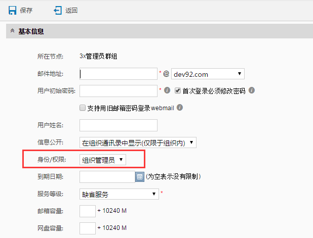 请注意为管理员分配服务等级,填写完成后保存创建成功。