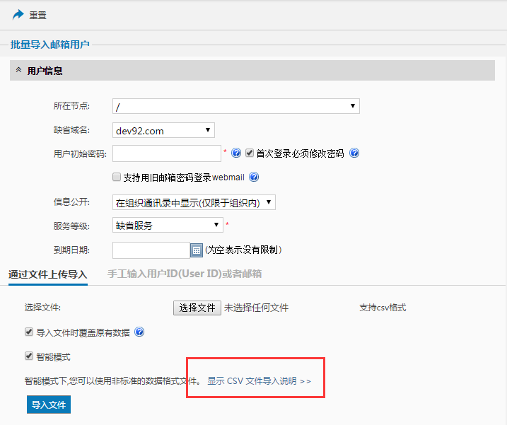 - 通过文件上传导入(.csv文件格式)。使用.csv文件格式上传的‘批量新建用户’具有最大的灵活性,管理员可以单独定义不同用户的所处组织、部门,所应用的服务等级、域名等等。根据系统要求,.csv文件格式为:首行提供字段属性名,第二行起根据首行的字段提供相应数据,每行仅指定一位用户的相关属性。管理员可以通过excel编辑保存需要的.csv文件。