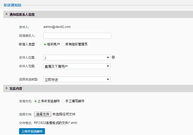 您可在运维管理-发送通知信页面进行邮件群发操作。可以向指定的组织邮箱用户对象发送群发邮件。可以上传预先写好的邮件,或手工编写需要发送的邮件,同时选择正确的接收方,最后单点‘发送’完成群发操作。